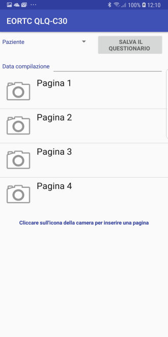 Per creare i questionari, utilizzando la camera del dispositivo, bisogna fotografare le singole pagine del protocollo cartaceo consegnato ai centri partecipanti allo studio e compilato dal paziente.